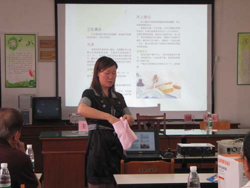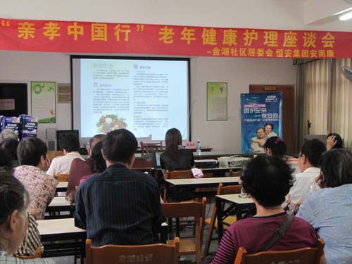 社会上越来越多的老年人需要专业的健康护理知识,为了更好地传授健康护理知识,关爱老年人,广西重阳老年公寓与恒安集团于2013年4月19日一起走进了南宁市金湖社区,开展“亲孝中国行”——老年健康护理座谈会,向社区里的老年人讲授尿失禁老人的健康护理,主要内容有日常护理、保健护理、心理护理,期间,王君香护士长亲自示范如何合更换纸尿裤以及如何给卧床老人进行关节运动等,受到了老年人的青睐,得到了老年人的称赞。会后,社区老年人积极向王护长提问,以了解更多老人健康知识。此次活动还引来了南宁电视台记者,并对王君香护士长进行了采访。