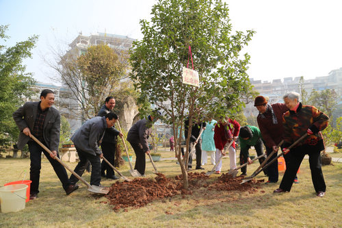座谈会后,与会领导、老人及家属代表一起来到公寓的花园参加了纪念树种植活动。为公寓今后的十年种下了希望之树。
