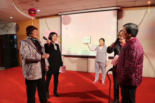 羊年的正月十四晚7:30我公寓全体员工和老人齐聚二楼舞厅,一场重阳版的《奔跑吧,兄弟》正在等着大家。活动内容包括“下腰过杆”“抢凳子”“挤眉弄眼吃饼干”“扮时钟”“你演我猜”。大家摩拳擦掌,跃跃欲试,现场充满了尖叫声和欢笑声。最后,行政二组、康复一区、颐养五区、行政一组分别获得了一二三等奖,其中康复一区和颐养五区并列荣获第二名。