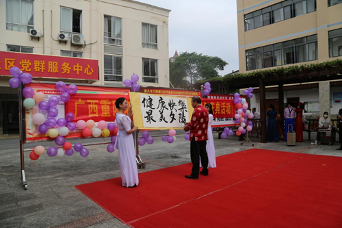 心连心艺术总团在为老人进行精彩纷呈、丰富多彩的演出时,在书法秀上写下“健康快乐,最美夕阳”的字帖为万力分院的老人们献上了一副朴实无华又情意满满的祝福。