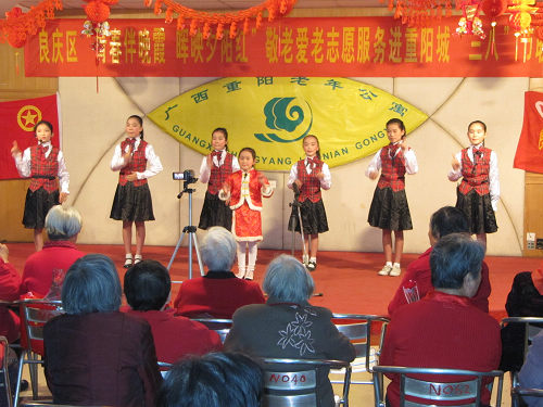 3月8日下午公寓二楼舞厅歌舞升平,为公寓的“三八”节增添了不少喜气。这次联谊会是由良庆区团委组织南宁四所中小学的志愿者到公寓进行特长表演。这四所学校分别是:大联小学、大沙田小学、阳光新城学校及五象中学。她们带来了节日的鲜花、饱含祝福的纸鹤及精彩的节目,另外大沙田小学还带来了米、油等作为礼物送给公寓的爷爷奶奶。联谊会还吸引了南宁电台及生活报的媒体记者,果然是一场不负老人期待已久的别开生面的联欢会。