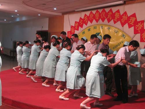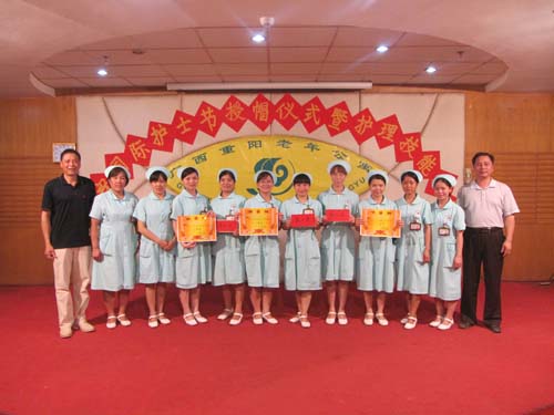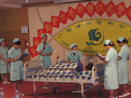 在第100个国际护士节到来之际,公寓于5月11日晚在舞厅隆重集会,庆祝护士节的到来。本次活动内容包括,为2011年取得护士职业资格的18名护士传光授帽,以及护理技能操作大赛。