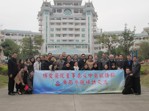 2013年1月9日香港博爱医院董事局及中医服务部领导到我公寓参观,广西中医药大学护理学院书记冼锦华、校长吴彬、广西重阳老年公寓院长黄颖陪同参观。