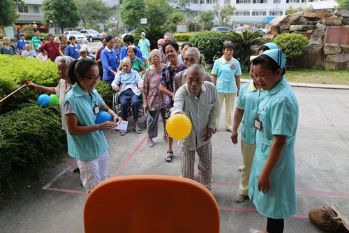 升旗仪式结束,益智而有趣的游园项目也开始了。此次游园活动设有6个项目——钓鱼、积木(形状配对)、投篮、飞镖、弹球、敲鼓。其中钓鱼、积木(形状配对)、投篮是新增项目,有一定的挑战性。可老人是不怕困难的,每个项目排队如长龙,第一次不成功继续排队。现场中也有很多是半自理的老人,他们在工作人员的协助下也异常活跃。看着这个忙而不乱,热闹而和谐的场面,来探访的家属都被感动了。国庆节是举国欢庆的日子,每个中国子民都为之自豪。尤其是耄耋之年的老人,他们的心情应该是和我们年轻一代不一样的。面对国旗,面对丰富多彩的游园活动,我们希望他们除了激动、感动之外,还应该有一颗积极乐观的心!因为不是只有艺术才让人年轻,活动也一样!