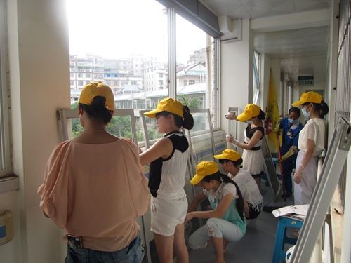为进一步弘扬五四精神,倡导文明新风,激励广大团员青年继承和发扬“五四”光荣传统,进一步增强立志献身劳动事业的光荣感和使命感。2015年5月3日上午8点30,广西重阳老年公寓的团员青年们在本院内开展了一次以“爱劳动,爱生活”为主题的五四青年节活动。参加这次活动的人员为本院的团员青年,共10人,活动的主要内容是对院内走廊处的玻璃窗进行清扫。活动一开始大家便自觉分工,有的拿抹布或报纸擦玻璃,有的就将纱窗拆下来清洗等等,整个场面热火朝天。不一会儿,一条长长的走廊玻璃窗就被擦的晶莹透亮、一尘不染。通过此次活动的开展,让广大团员青年进一步弘扬了热爱生活、热爱劳动的五四精神,也为公寓贡献了自己的一份力量、奉献自己的一份爱心。