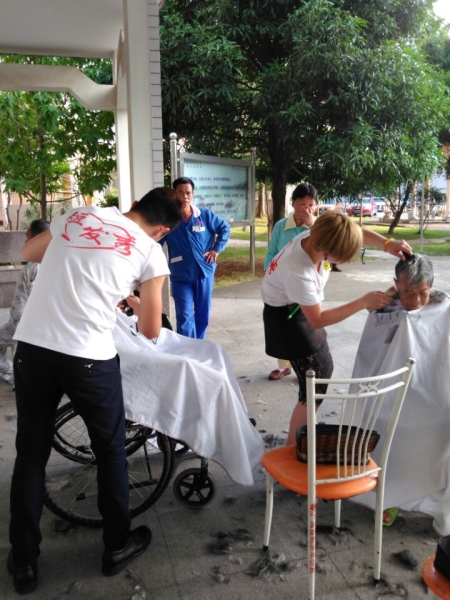 1号,2号……64号,当最后一名老人理完头发后已是下午5:30了。夕阳西晒下,他们的脸颊被映照得红扑扑的,额头上冒着豆大的汗珠,一下午都没顾得上喝一口水。他们有个气派的理发店叫“短发秀美发沙龙”,一下午本可以赚取几千块钱的辛苦费,但他们却放弃了这笔收入,从玉洞不辞辛苦地来到大沙田为养老院里的爷爷奶奶义剪。他们是普通的手艺人,但却有着无私的奉献精神;他们没有轰轰烈烈的行为,只是为老人简单地理发,但这一刀一剪却“剪”掉了老人内心的孤独,“剪”出了老人愉悦的心情,同时也沸腾了老人的心田,他们不为别的,就为“责任”二字,其实正能量的传承并没有想象中那么难,只要有感恩的心即可!