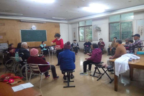 心理咨询顾问余方老师在引导老人进行鼓圈游戏