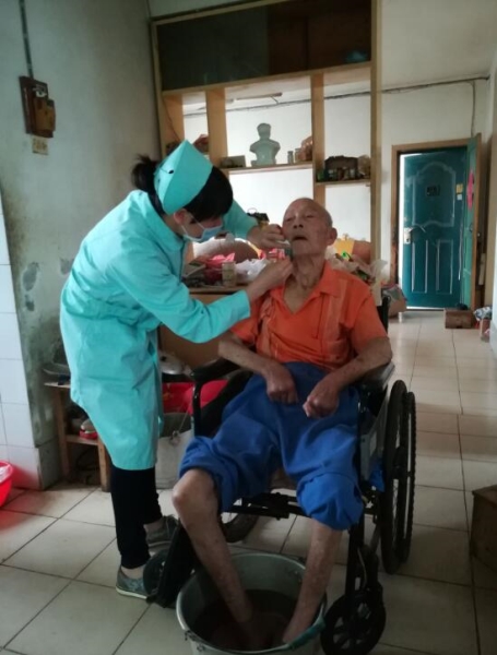 尤其是到了卢大叔家时,我们看到大叔基本是卧床的,由于家庭护理经验不足,老人家的背部出现了很大片压疮,不适宜洗澡,只好为老人换洗衣服,刮胡子和泡脚,让他坐起来,舒服一些。随后我们的医护人员也针对老人的这个情况和家属沟通,建议家属将老人送到机构去,以获得专业的护理,控制压疮的恶化。
