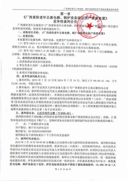 广西重阳老年公寓拟对《广西重阳老年公寓电梯、锅炉设备固定资产报废处置》项目进行竞争性谈判采购,现将有关事项通知如下: