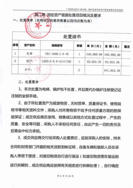 《广西重阳老年公寓电梯、锅炉设备固定资产报废处置》