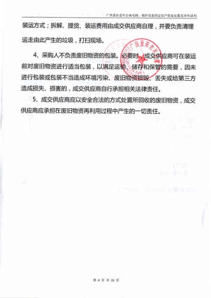 5、成交供应商应以安全合法的方式处置所回收的废旧物资,成交供应商应承担在废旧物资再利用过程中产生的一切责任。