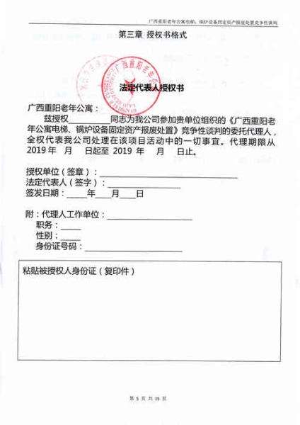 兹授权 同志为我公司参加贵单位组织的《广西重阳老年公寓电梯、锅炉设备固定资产报废处置》竞争性谈判的委托代理人,全权代表我公司处理在该项目活动中的一切事宜。代理期限从 2019年 月 日起至 2019 年 月 日止。