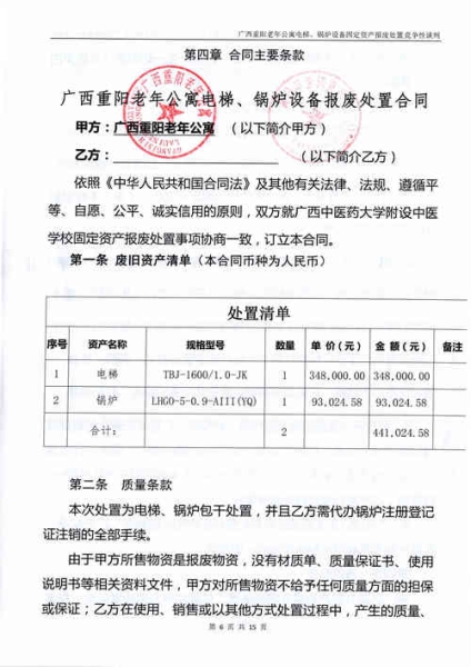广西重阳老年公寓电梯、锅炉设备报废处置合同
