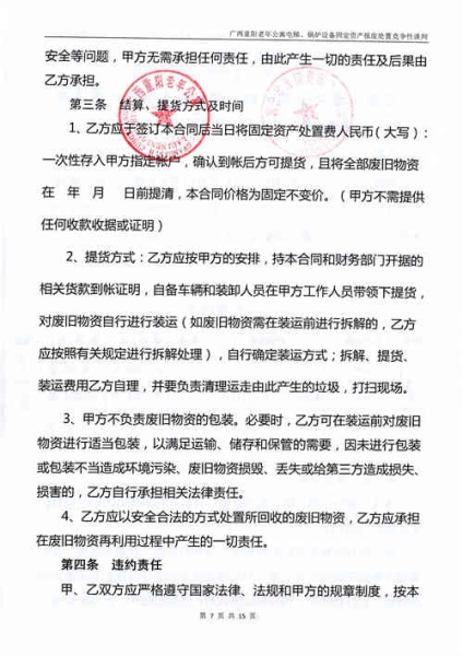 1、甲方所处理的废旧物资,全部以现场的实物为准。乙方在处理以上废旧物资时,以不危害、破坏环境为前提,必须遵守国家关于环保、安全、环境等方面的法律、法规。否则,由此造成的一切后果均由乙方承担。