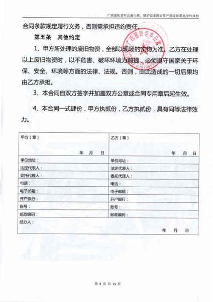 4、乙方应以安全合法的方式处置所回收的废旧物资,乙方应承担在废旧物资再利用过程中产生的一切责任。
